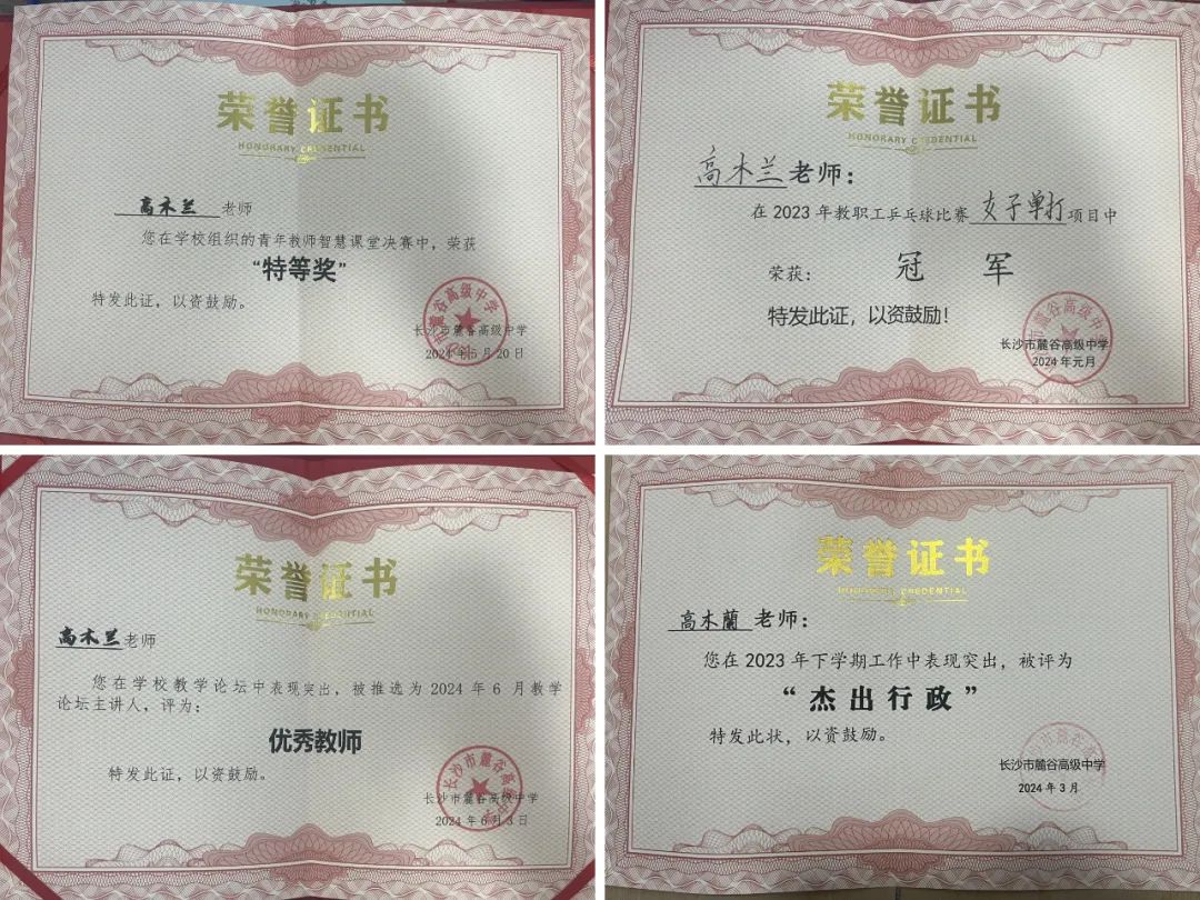 多年的教学经验,为高老师看待问题提供了更多视角,也为她的工作注入了更多智慧。课上的她潇洒自如、底蕴深厚;课下的她做事严谨,刚柔并济。高老师任教以来学生成绩年年位居前列;教师技能比赛获长沙市一等奖;市、省级获奖论文数十篇;曾屡次担当示范课的主讲人;主动投身于送课下乡活动,她热爱运动,是学校的乒乓球冠军,还主动策划系列校内、校外教研活动,获“教学论坛优秀教师”,在2024年的青年教师智慧课堂决赛中,更是以最高分获得特等奖。同事们说她是学生喜爱的好朋友、是富有教学智慧的好老师。